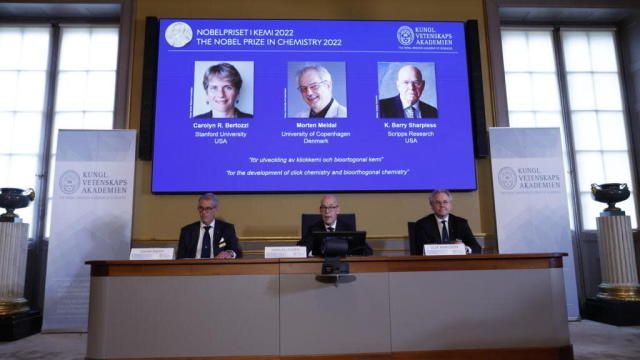 Le prix Nobel de chimie 2022 a été décerné, ce mercredi 5 octobre, aux Américains Carolyn R. Bertozzi et K. Barry Sharpless et au Danois Morten Meldal. Le trio est attribué « pour le développement de la "chimie click" et de la chimie bioorthogonale », a indiqué le jury dans sa décision. Le chercheur américain Barry Sharpless, basé en Californie et le Danois de 58 ans, Morten Meldal, de l'université de Copenhague, sont récompensés pour leurs travaux pionniers en matière de « chimie click » qui permet de rassembler des molécules entre elles comme on le ferait avec un bouton-pression. Ceci est particulièrement utilisée pour croître des traitements pharmaceutiques, cartographier l'ADN ou créer de nouveaux matériaux. Barry Sharpless, âgé de 81 ans, est uniquement la cinquième personne à remporter deux fois un Nobel. Il avait déjà reçu le prix de chimie en 2001 pour ses découvertes sur la technique de catalyse asymétrique.