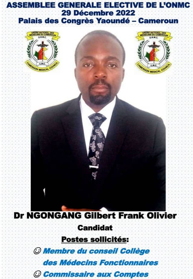 « Dans le cadre des élections pour le renouvellement des membres du Conseil de l’Ordre national des Médecins du Cameroun,(ONMC) qui doit avoir lieu le 29 décembre 2022 au Palais des Congrès de Yaoundé, j’ai l’honneur de présenter ma candidature comme membre du Conseil(corps des fonctionnaires », a déclaré le Dr Gilbert Franck Olivier Ngongang.