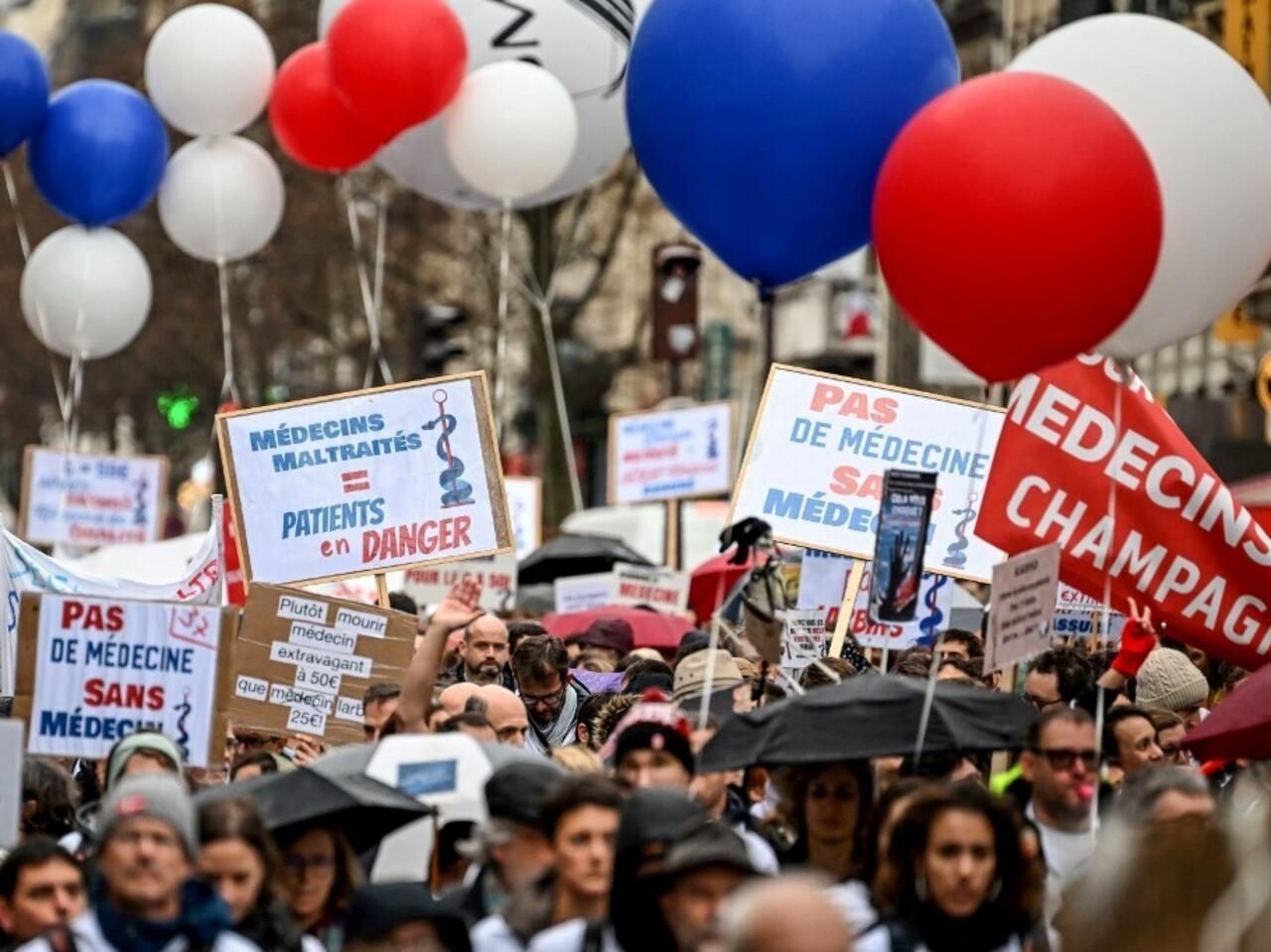 Après une première grève début décembre, le collectif Médecins pour demain avait appelé à la fermeture des cabinets médicaux après Noël, mouvement reconduit jusqu'au 8 janvier. Ainsi, des milliers de médecins libéraux ont manifesté ce jeudi 5 janvier à Paris pour obtenir une revalorisation de la consultation. Le cortège est parti du Panthéon, dans le Ve arrondissement de Paris, pour rejoindre le ministère de la Santé. Les pancartes traduisaient le ras-le-bol des protestataires en blouse blanche, épuisés par des conditions de travail qu'ils jugent mauvaises. « C'est la médecine qu'on assassine », « Médecins, pas larbins » ou encore « On vous soigne, soignez-nous ». À l'arrivée, les manifestants, venus de toute la France, 4 000 d'après les organisateurs, se sont agenouillés et ont brandi leur stéthoscope en observant une minute de silence. Ces professionnels de santé revendiquent, le doublement du tarif de base de consultation (de 25 à 50 euros), une meilleure organisation des soins pour libérer du temps médical, des incitations à l'installation ou encore la facturation des rendez-vous non honorés. Une situation inconfortable qui vient paralyser ce corps de metier déjà en proie à plusieurs mécontentements.
