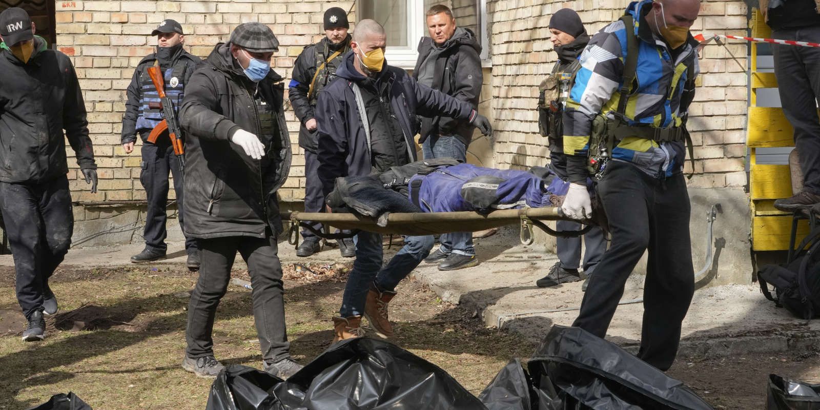 Des corps éparpillés dans les rues dont certains avec les mains liées dans le dos par du scotch ou du tissu blanc et d'autres criblés de balles. Des fosses communes dans lesquelles sont enterrés des cadavres, sont entre autres, le désastre trouvé dans la banlieue de Kiev, après de le départ des troupes russes.