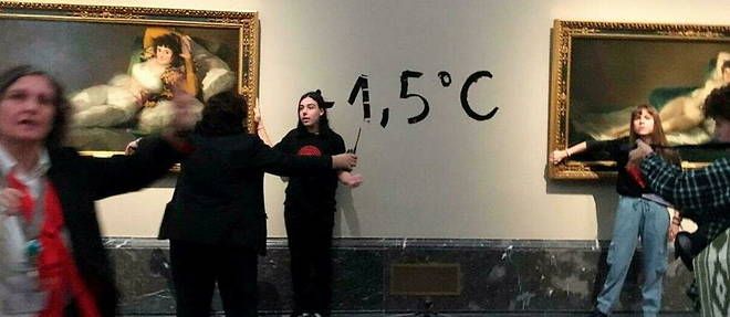 Une autre action de vandalisme sur une œuvre d’art. Deux militantes écologistes se sont serrées les coudes ce samedi 5 novembre sur le cadre de deux tableaux de Goya, au musée du Prado à Madrid, pour dénoncer l’inaction des dirigeants face au réchauffement climatique, a-t-on appris auprès de la police espagnole. Ces deux partenaires, qui n’ont pas abîmé les tableaux, les ont plutôt tagué « +1,5°C » sur le mur entre les deux peintures, en référence au but de réchauffement que s’est fixé la communauté internationale. Elles ont été interpellées de ce fait par la police du pays.