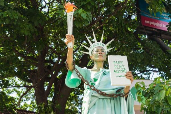 Theary Seng s’était précédemment présentée en costume de détenu. En ce jour de verdict, cette activiste s’est déguisée en statue de la liberté enchainée pour se tenir face à la cour.