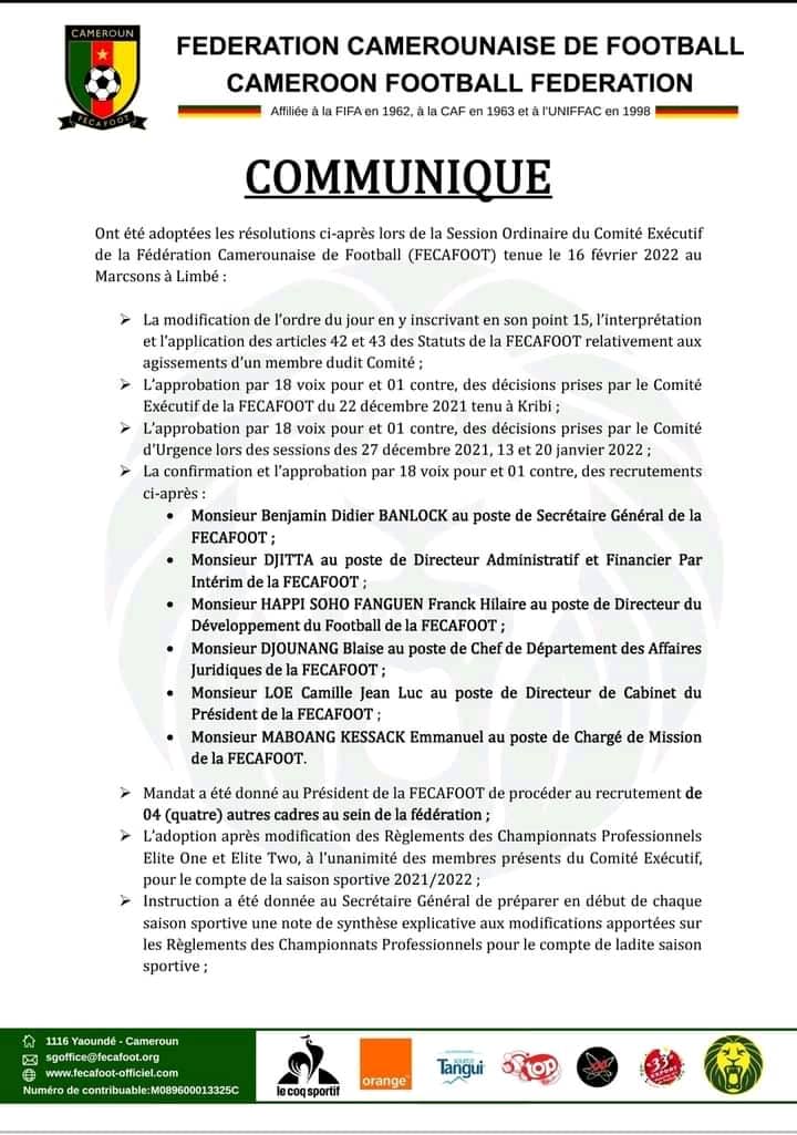 Cette session a également permi la confirmation de certains cadres nommés récemment à leurs postes respectifs. Il s'agit du secrétariat général qui sera dirigé par Benjamin Didier Banlock, du Directeur du développement du football, Franck happy.